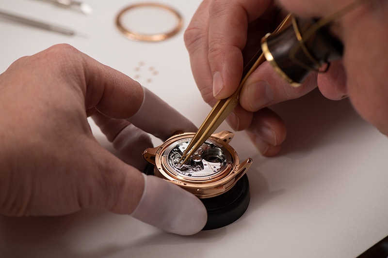 これらのイノベーションによって、より薄く装着感に優れた方法で複雑機構を組み込むことが可能になると同時に、より頑丈で視認性の高いムーブメントを実現することができました。外周部に取り付けられた自動巻き機構は両方向巻上げ式で、ほとんど摩擦の影響を受けません。カール F. ブヘラの「フローティングトゥールビヨン」は、数世紀にわたるコンセプトを飛躍的に進化させたものです。外周部で支えられたミニッツリピーターレギュレーターは独自の方法で6時位置に配置され、文字盤上で目に見えるようになっています。この技術を実現するために、時計職人たちは機構を全面的に設計し直す必要がありました。
