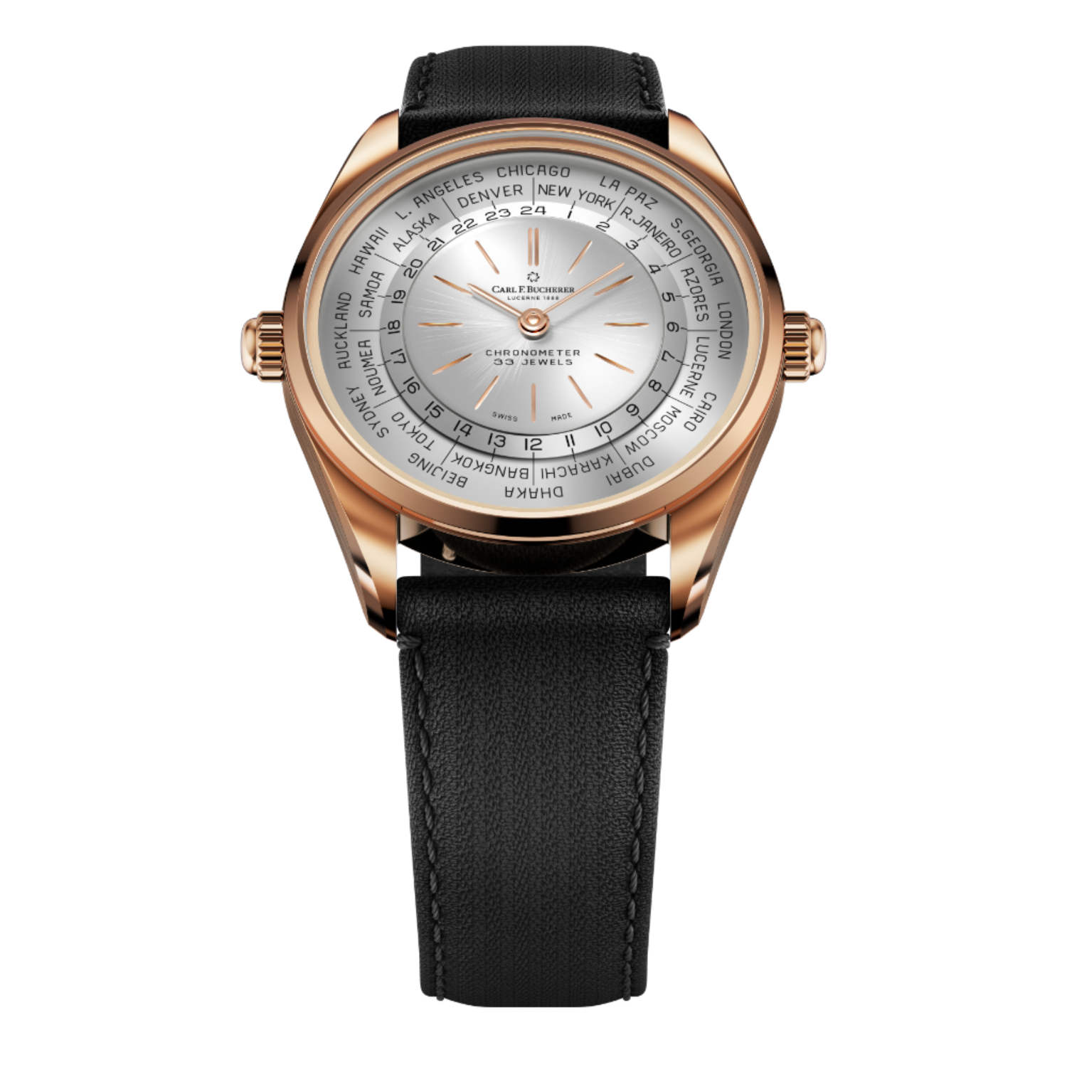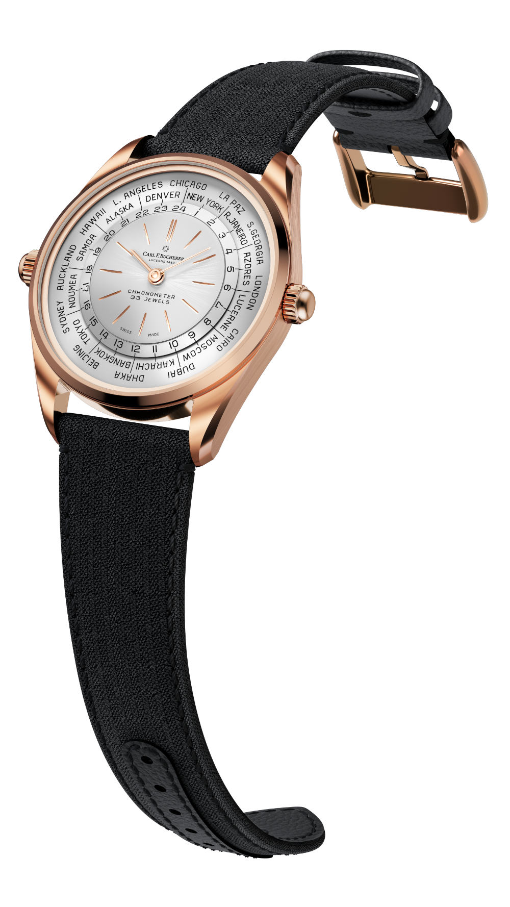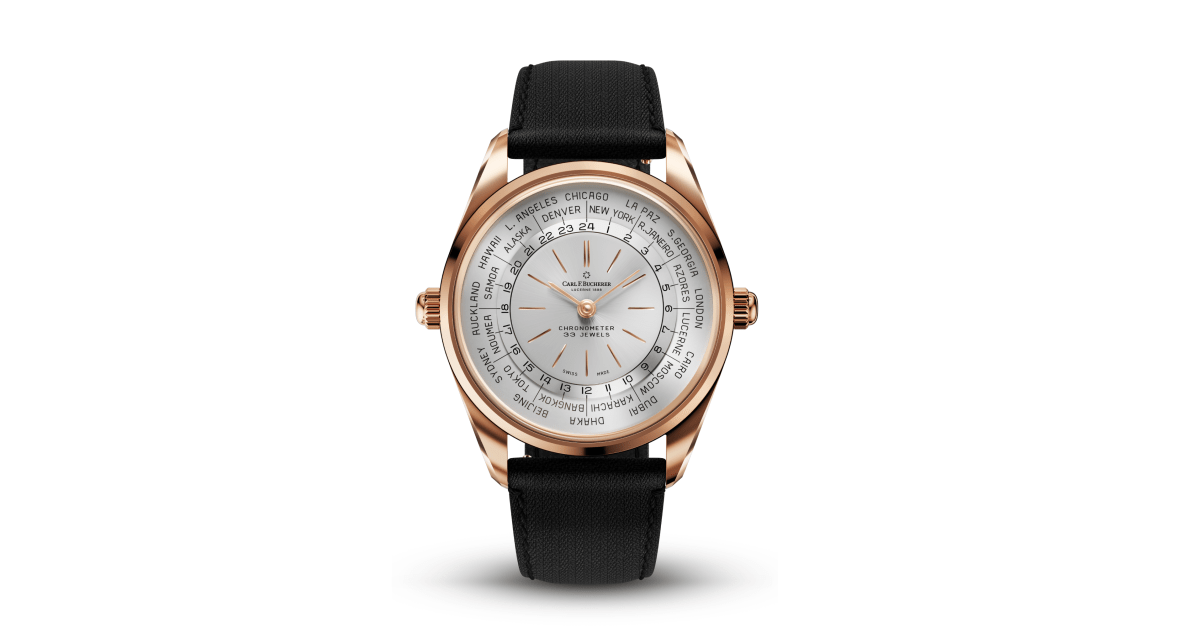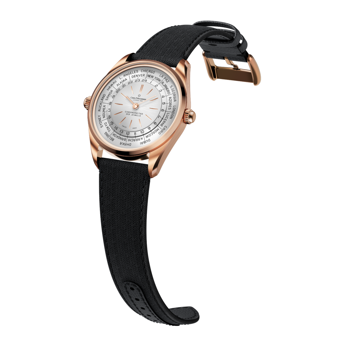 The original Worldtimer appealed to this new generation of travelers by being one of the first watches to incorporate a second time zone. At the time, the timepiece brought to life the brand’s cosmopolitan spirit and global mindset – values that remain as important today as they were then. It also demonstrated the technical finesse of its watchmakers, as displaying two time zones simultaneously on one watch was completely new. The timepiece demonstrated how CFB’s watch designers were themselves Exploring Time. This was expressed through an innovative case complication that deployed a simple gear train, operated by a second crown at 9 o'clock, to drive a city disk that displays a second time zone, as required.