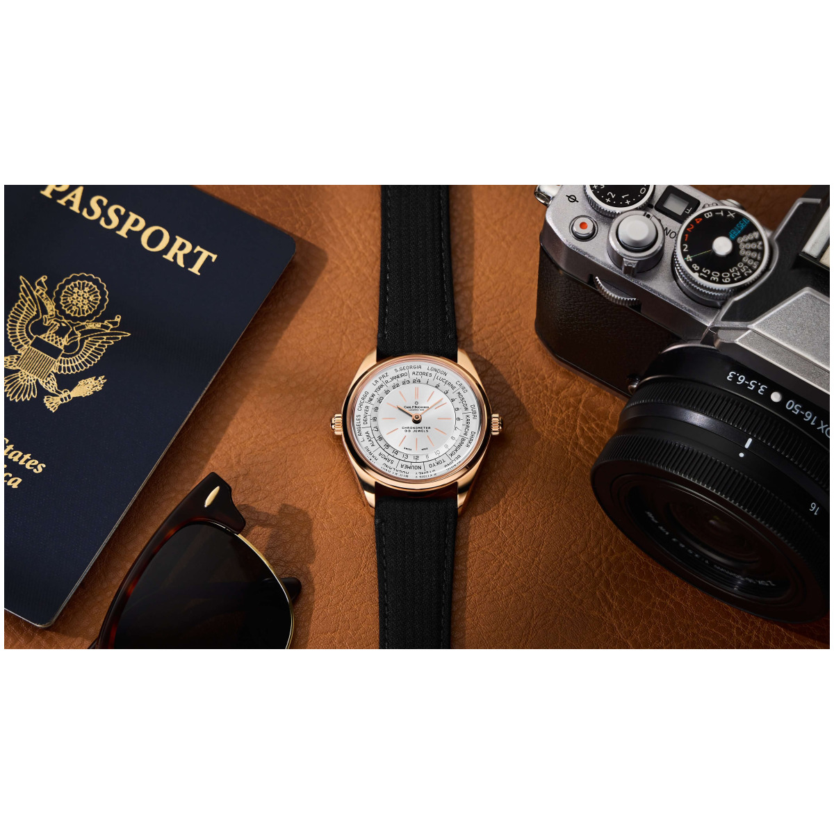 The two crowns – one to wind the movement and adjust the time, the other to operate the time-zone complication – have been ergonomically redesigned. Some of the names of cities on the dial’s outer disk have changed, reflecting the modern world’s key commercial hubs, but the font in which they appear remains astonishingly similar.