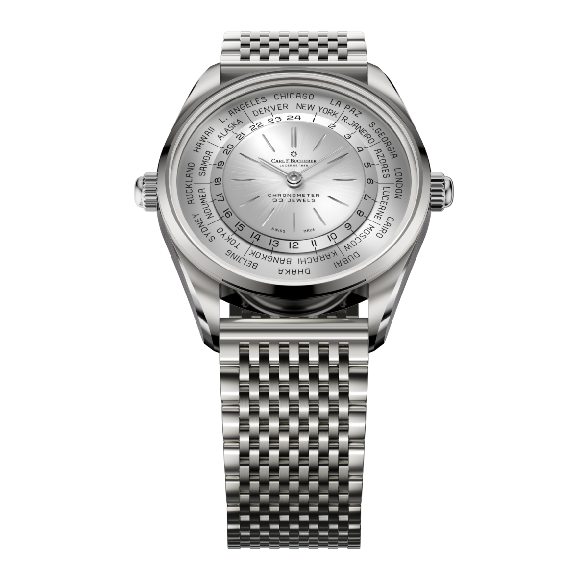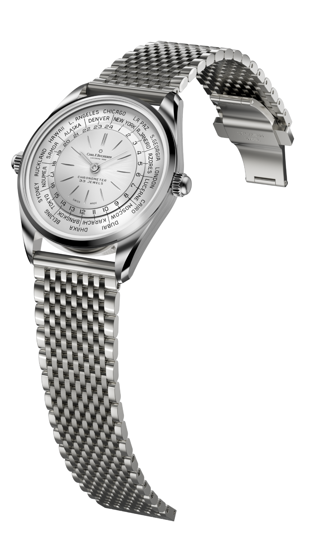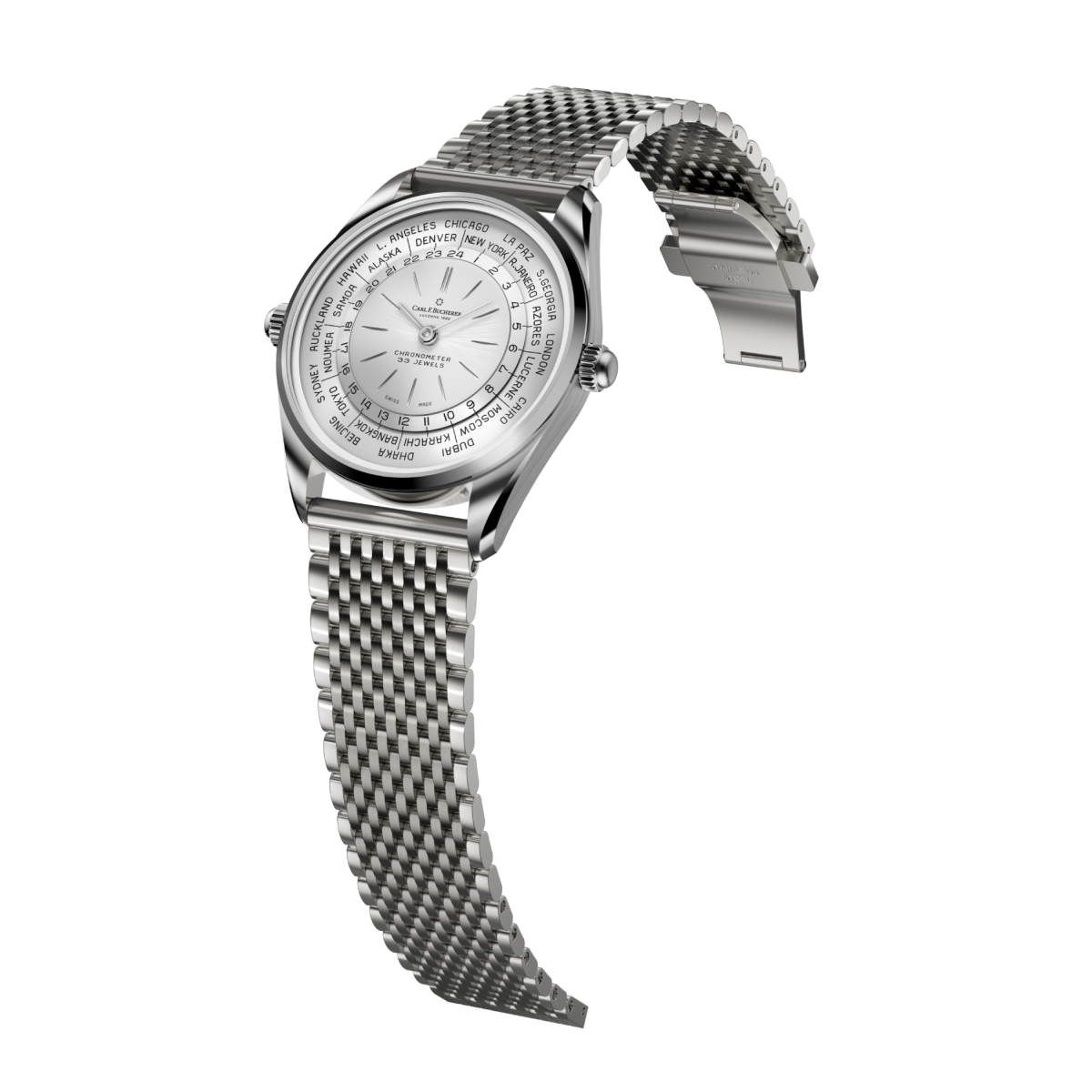 The original Worldtimer appealed to this new generation of travelers by being one of the first watches to incorporate a second time zone. At the time, the timepiece brought to life the brand’s cosmopolitan spirit and global mindset – values that remain as important today as they were then. It also demonstrated the technical finesse of its watchmakers, as displaying two time zones simultaneously on one watch was completely new. The timepiece demonstrated how CFB’s watch designers were themselves Exploring Time. This was expressed through an innovative case complication that deployed a simple gear train, operated by a second crown at 9 o'clock, to drive a city disk that displays a second time zone, as required.