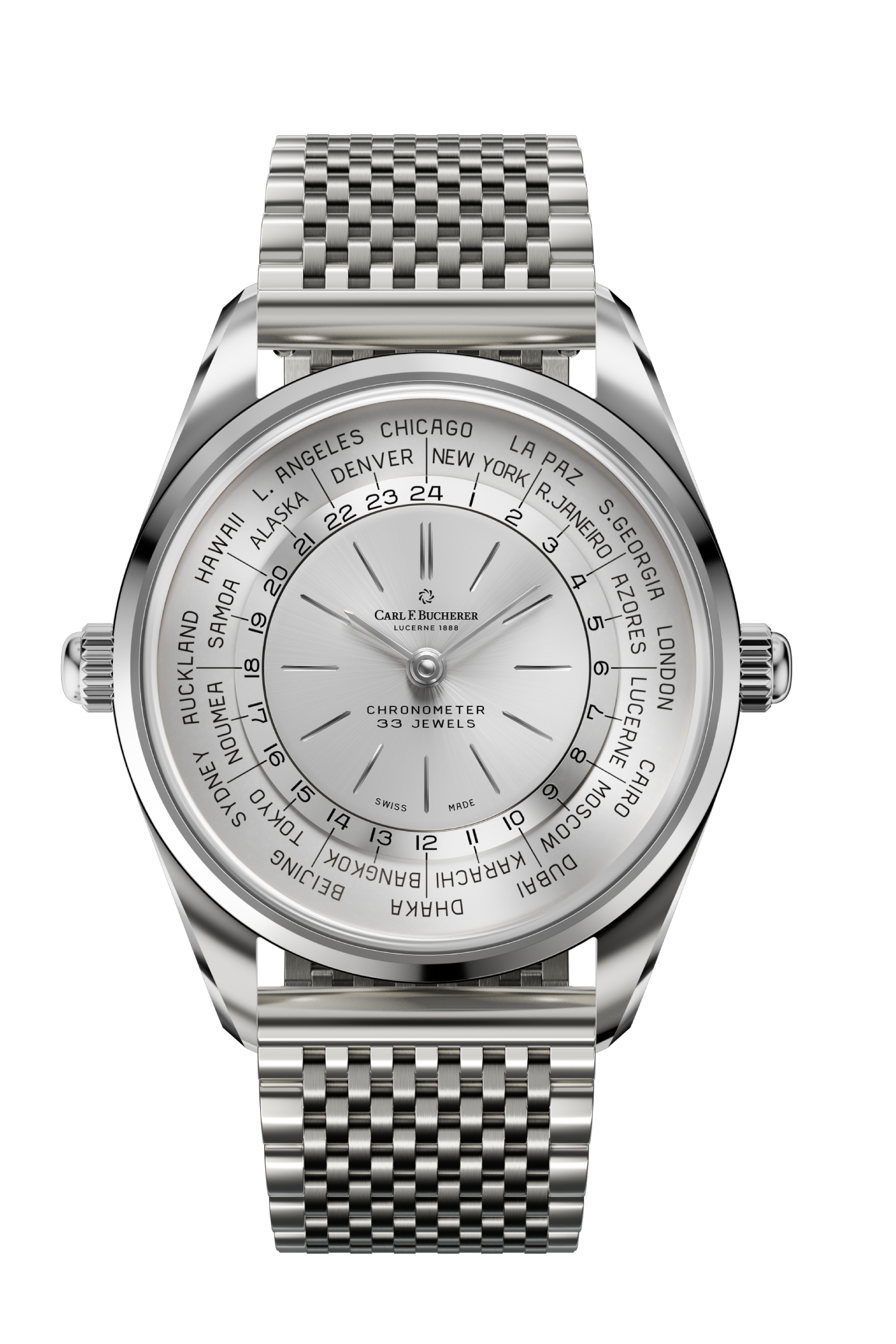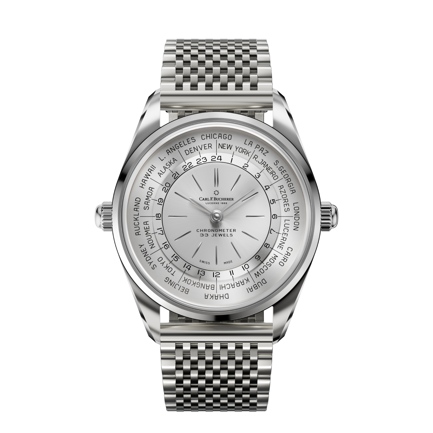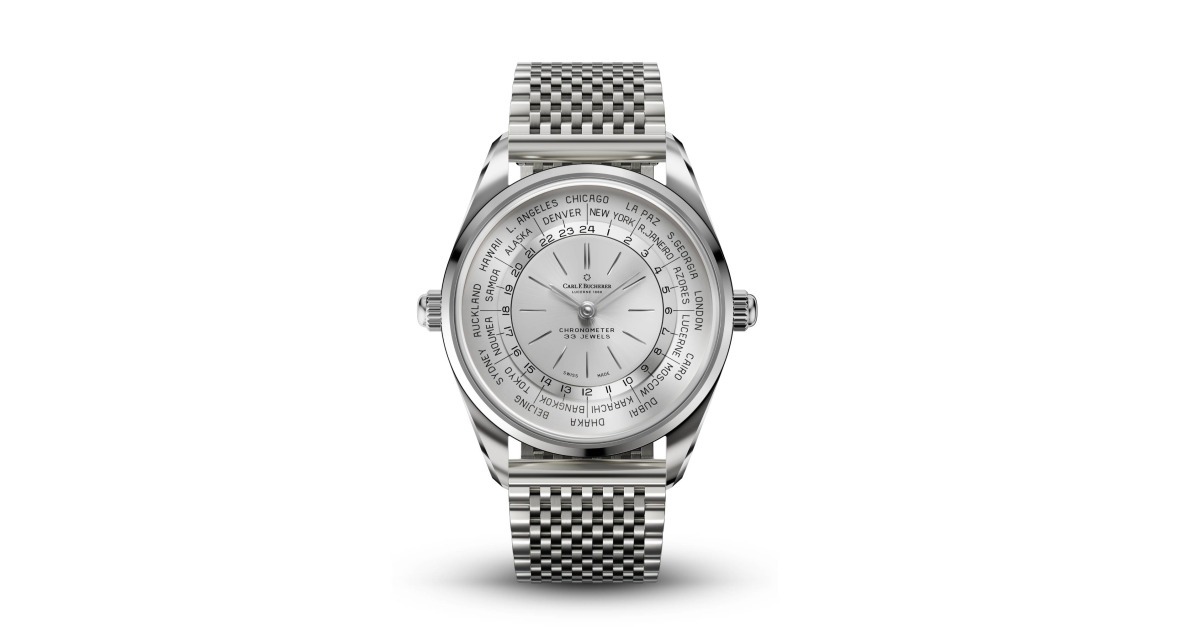 The original Worldtimer appealed to this new generation of travelers by being one of the first watches to incorporate a second time zone. At the time, the timepiece brought to life the brand’s cosmopolitan spirit and global mindset – values that remain as important today as they were then. It also demonstrated the technical finesse of its watchmakers, as displaying two time zones simultaneously on one watch was completely new. The timepiece demonstrated how CFB’s watch designers were themselves Exploring Time. This was expressed through an innovative case complication that deployed a simple gear train, operated by a second crown at 9 o'clock, to drive a city disk that displays a second time zone, as required.